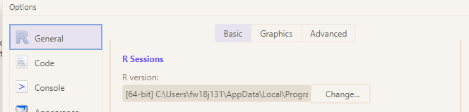 - Stellt sicher, dass eure R-Version relativ aktuell ist (4.4.2 oder neuer). Welche R-Version ihr aktuell nutzt seht ihr beim Programmstart von RStudio in der Konsole, oder wenn ihr auf Tools –> Global Options –> General –> R Sessions: R Version und dann auf Change… klickt. Dort könnt ihr eine der installierten R-Versionen auswählen. Manchmal benutzt RStudio automatisch eine alte Version, obwohl eine neuere bereits installiert wurde.